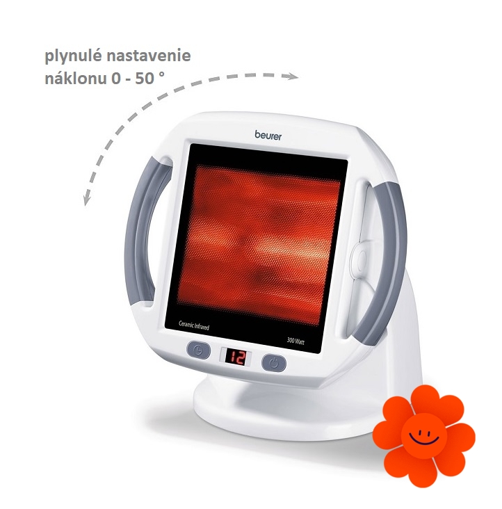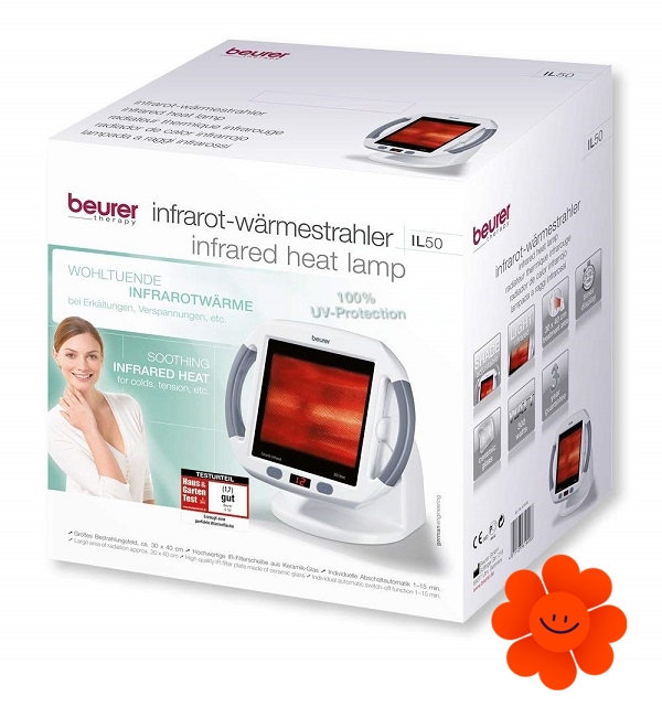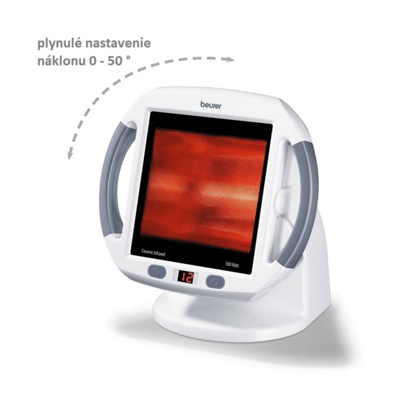 Digitální lampa IL50 od německé značky Beurer s výkonem 300 W pracuje s teplým světlem infračerveného spektra, které organismu pomáhá regenerovat a uvolnit se. Nastavitelná obrazovka nabízí uživateli plynulé nastavení náklonu v rozmezí 0 - 50 °, které se přizpůsobí poloze vašeho těla během léčby. Velikost ozařovaného pole je 30 x 40 cm, sklokeramický povrch přitom zajišťuje 100% ochranu před UV zářením. Kromě toho je lampa vybavena digitálním časovačem, kde si můžete nastavit požadovaný čas působení, a to od 1 do 15 minut. Po uplynutí nastaveného času se lampa automaticky vypne. Díky ochraně proti přehřátí a aktivní ventilaci je použití infračervené lampy IL50 dokonale bezpečné.