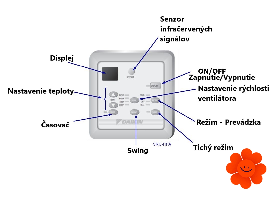 Umožňuje nastavení základních řídících funkcí, jako Tichý režim, Autorestart, Možnost nastavení adres. Rovněž vás upozorní na nutnost čištění filtru. Přijímač pro standardní infračervený dálkový ovladač je zabudovaný v zařízení.