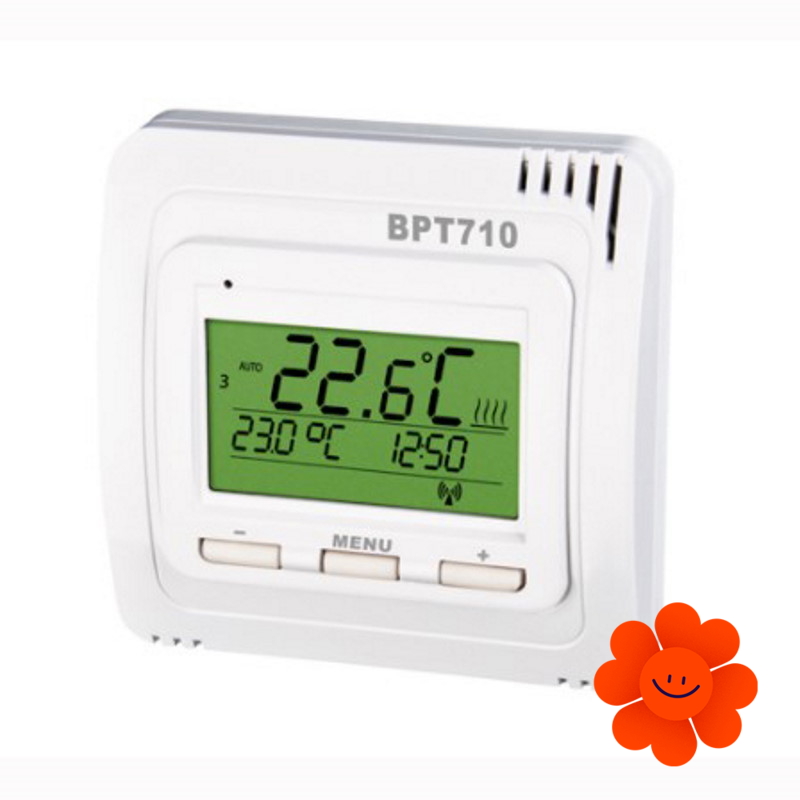 Elektrobock BT710 RF je bezdrátový, prostorový, elektrický termostat, který podle požadované teploty v místnosti ovládá přijímací jednotky BT001, BT002 a BT003. Termostat je schopen ovládat až 9 spínacích přijímačů na vzdálenost minimálně 35 metrů (v zástavbě). Termostat disponuje rozšířenými funkcemi s možností naprogramování až 7 týdenních programů se 6 teplotními změnami denně. Ovládání je jednoduché pomocí dvou tlačítek, která regulují teplotu krokově po 0,5 °C. Regulací připojeného zařízení můžete ušetřit až 30 % energie.