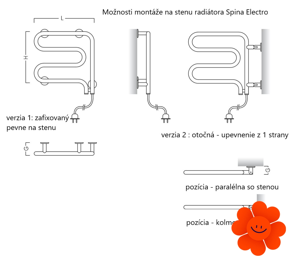 Díky správně navrženému tvaru, radiátor Spina Electro zaručuje zvýšenou účinnost sušení. INSTAL-PROJEKT nabízí 2 volitelné druhy montáže radiátoru Spina Electro: 1. pevná fixace na zeď, 2. uchycení jen na jedné straně - možnost otáčení konstrukce radiátoru do prostoru. Výjimečná funkčnost otočné verze tohoto radiátoru - suší i ohřívá tam, kam ho otočíte.