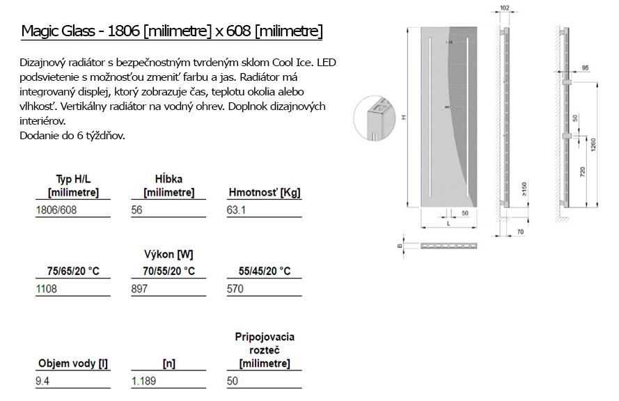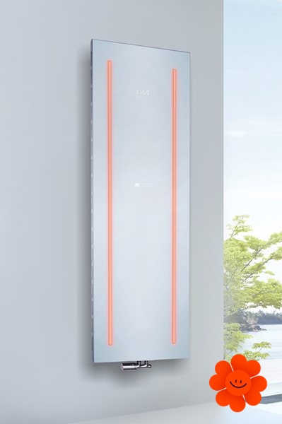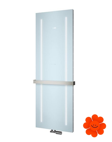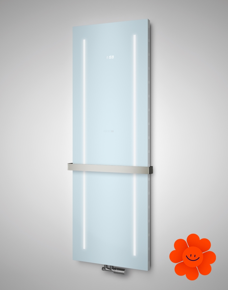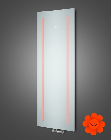Tento bytový skleněný radiátor funguje na vodní ohřev. Díky vysokému výkonu a minimalistickému designu se hodí do každého moderního interiéru. Radiátor je doplněný o LED podsvícení s možností změnit barvu a jas. Radiátor má integrovaný displej, který zobrazuje čas, teplotu okolí nebo vlhkost.