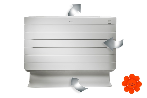 Výstup vzduchu je umístěn na horní straně klimatizace. Nasávání vzduchu je na spodních panelech.