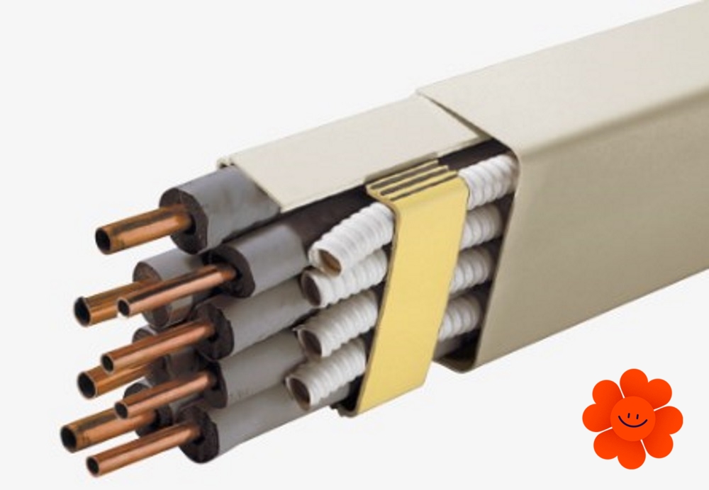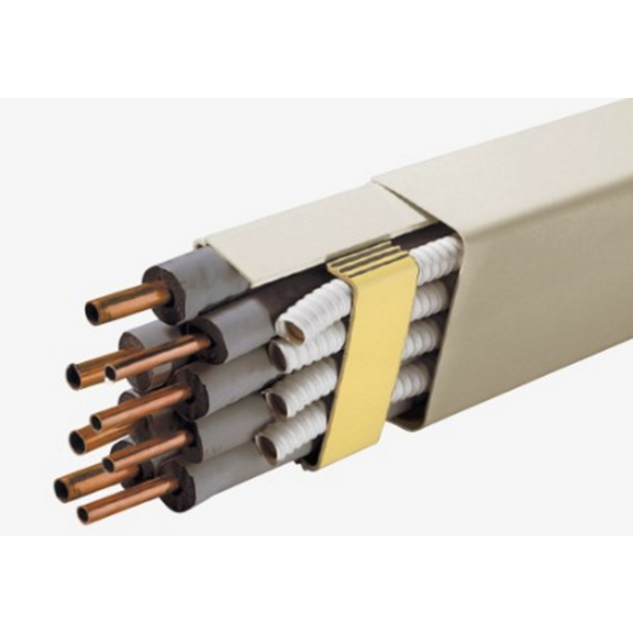 Plastový žlab 1412BCF potažený ochrannou fólií slouží k uložení rozvodů (měděné potrubí, kondenzační hadice, elektrický kabel) klimatizace.