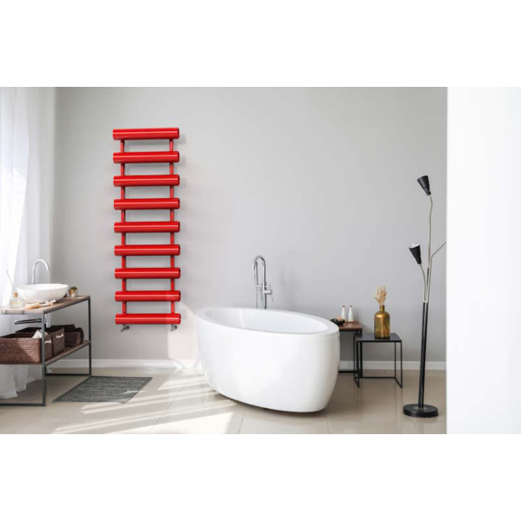 Jeho masivní horizontální trubky s otevřenými konci nejsou jen vizuální dominantou prostoru, ale zároveň poskytují dostatek místa pro zavěšení a ohřev ručníků.