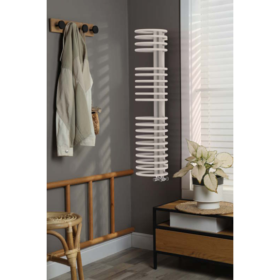 Chytrá rozteč mezi kruhovými prvky umožňuje pohodlné zavěšení ručníků přímo do středu radiátoru, což oceníte zejména v koupelně nebo předsíni.