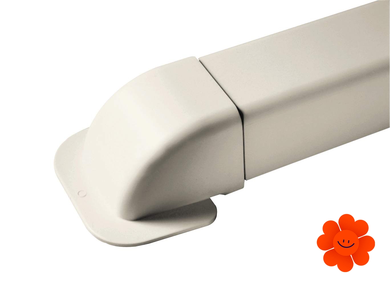 Plastová rohová průchodka 1409CM slouží k ukončení plastového potrubí pro uložení rozvodů klimatizace při přechodu přes zeď.
