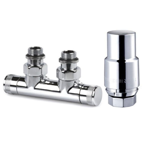 Rohový středový termostatický designový ventil s dvojitou zpátečkou - sada obsahuje středový ventil (0699), termostatickou hlavici Domus a 2x šroubení.