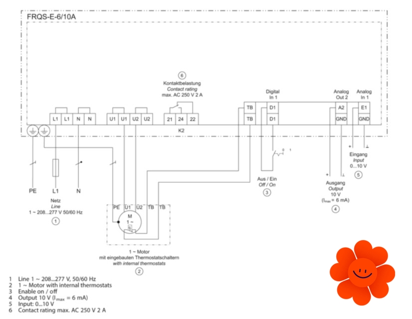 Frekvenční měnič Systemair FRQS-E-6A má analogový vstup pro externí nastavení otáček (0-10V, 0-20mA, PWM). Na manuální ovládání otáček je nutné připojení externího potenciometru např. typu MTV resp. MTP.