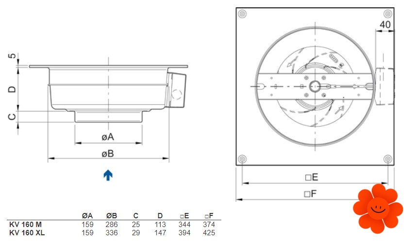 Systemair KV 160 XL sileo kruhový ventilátor je určený pro montáž na stěnu nebo strop s možností připojení kruhového potrubí pro odvádění vzduchu. Motor má vnější rotor a oběžná kola s lopatkami zahnutými dozadu. Motor ventilátoru má pro svou ochranu vestavěné tepelné kontakty s manuálním resetem.