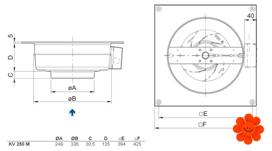Systemair KV 250 M sileo kruhový ventilátor je určený pro montáž na stěnu nebo strop s možností připojení kruhového potrubí pro odvádění vzduchu. Motor má vnější rotor a oběžná kola s lopatkami zahnutými dozadu. Motor ventilátoru má pro svou ochranu vestavěné tepelné kontakty s manuálním resetem.