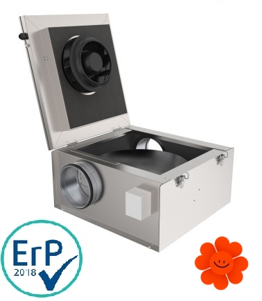 Kruhový ventilátor má bezúdržbový EC motor a dozadu zahnuté lopatky oběžného kola. Motor a oběžné kolo jsou montovány na výklopných dvířkách, čímž se stává údržba a čištění mnohem jednodušší. Tepelná ochrana motoru je zajištěna vestavěným tepelným kontaktem s manuálním resetem.