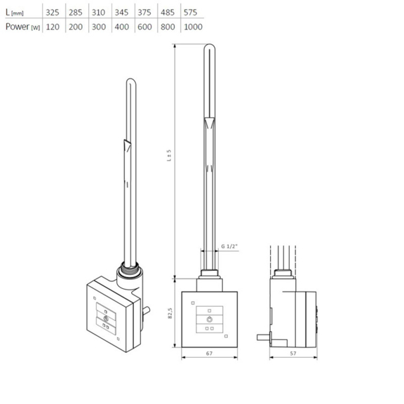 Provozní napětí: 230V/50Hz, I. třída ochrany, rozsah teplot 50 % a 100 % z nominální topné síly (2 stupně), připojovací závit G1/2" vnější (na topné tyči), výkon topné tyče 120-1000 W.