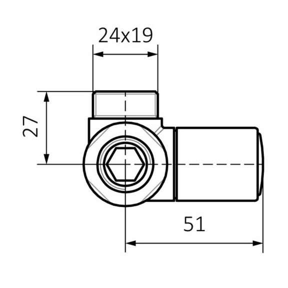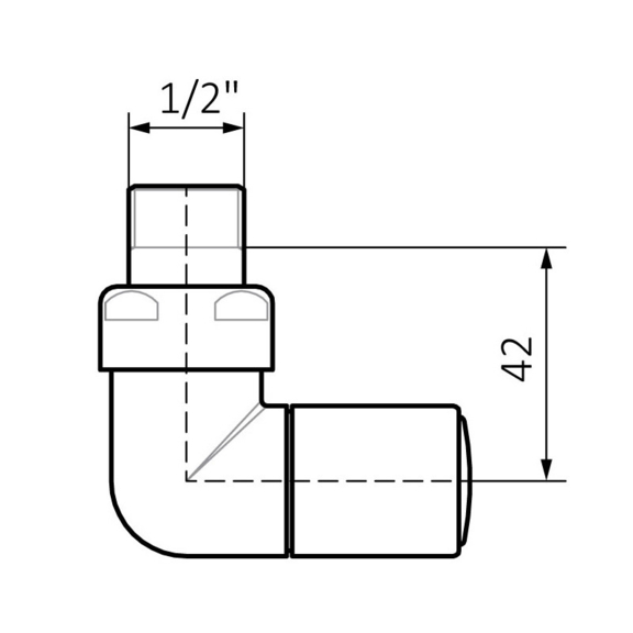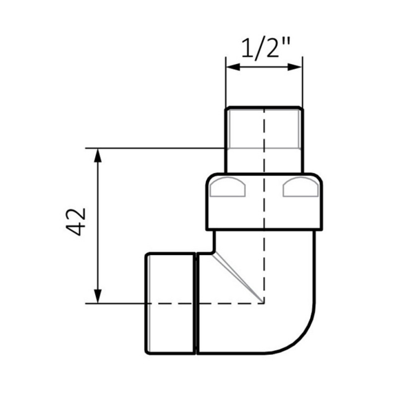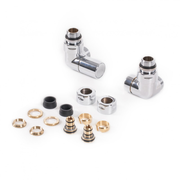Levá manuální úhlová sada obsahuje: regulační ventil, uzavírací ventil, adaptéry AL-PEX ∅ 16x2 a měď ∅ 15.