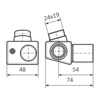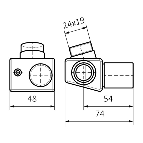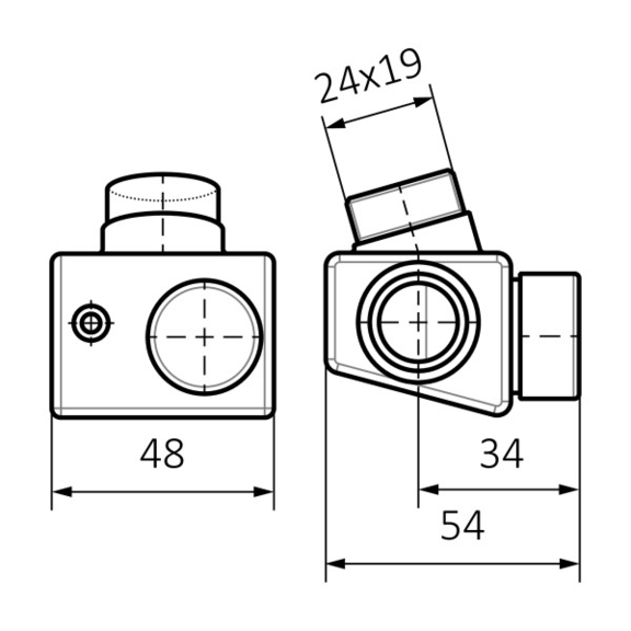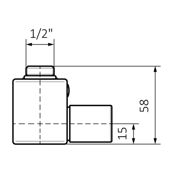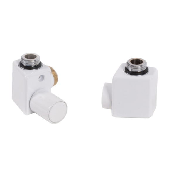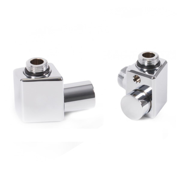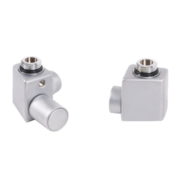 Levá manuální úhlová sada obsahuje: regulační ventil, uzavírací ventil, adaptéry AL-PEX ∅ 16x2 a měď ∅ 15.
