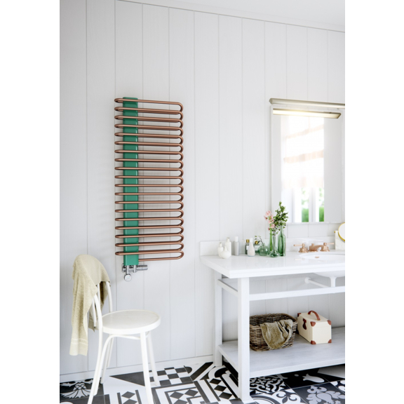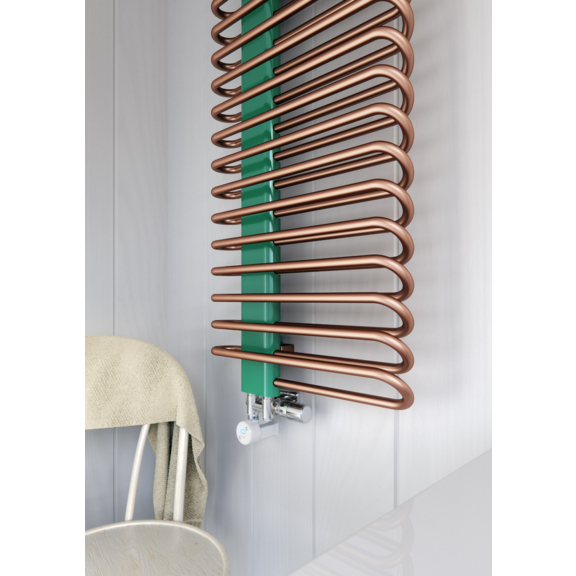 Moderní alternativa klasického trubkového radiátoru do koupelny. Asymetricky umístěn kolektor a zajímavě spirálovitě zakřivené profily tvoří prostorové, otevřené těleso.