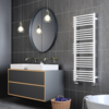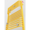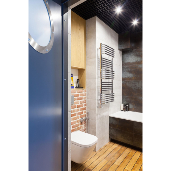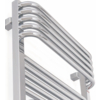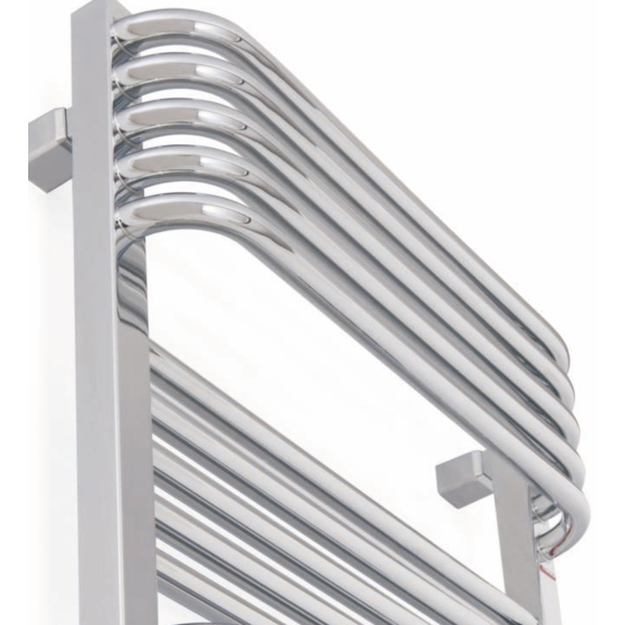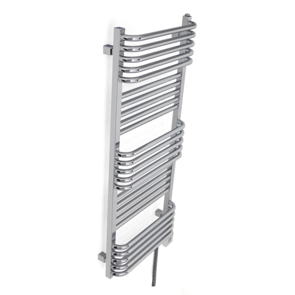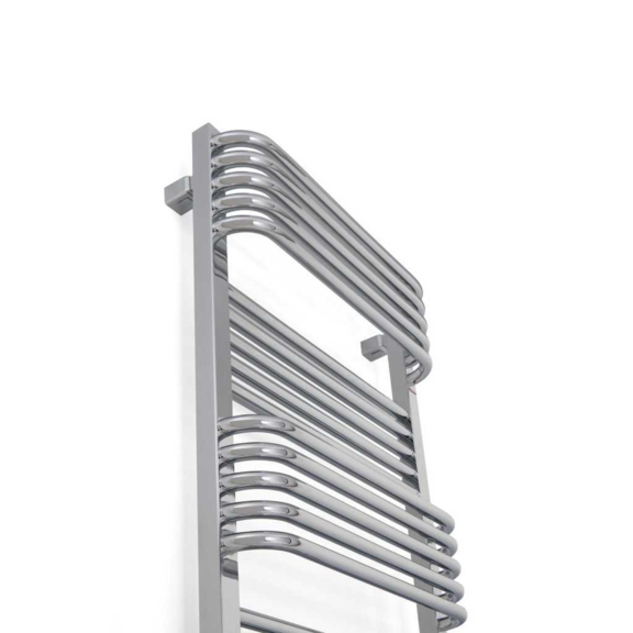 Efektivní a praktický elektrický koupelnový radiátor Pola. Ohnutá trubka a mezery mezi částmi usnadňují zavěšení textilií na sušení.