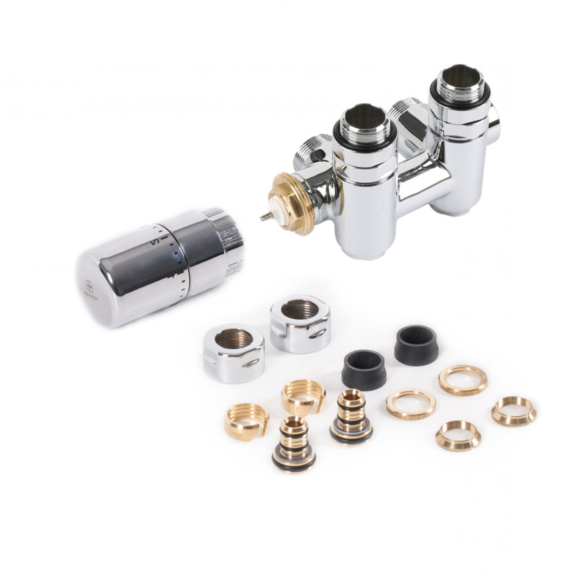 Pravá termostatická středová sada obsahuje: termostatický ventil, uzavírací ventil, termostatickou hlavici SLIM, adaptéry AL-PEX ∅ 16x2 a měď ∅ 15.