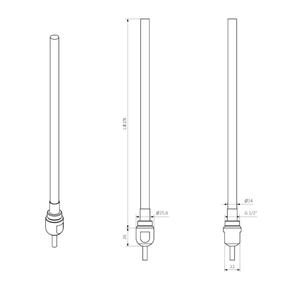 Provozní napětí: 230V/50Hz, I. třída ochrany, konstantní teplota 65°C, připojovací závit G1/2" vnější (na topné tyči), výkon topné tyče 100-1500W.
