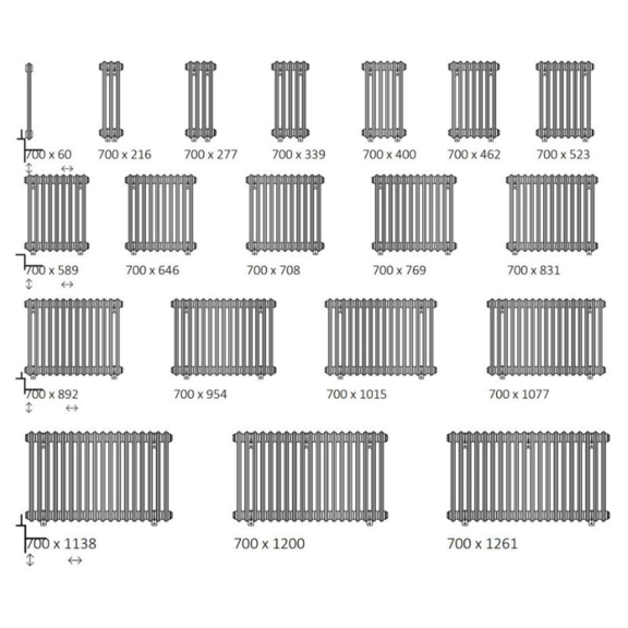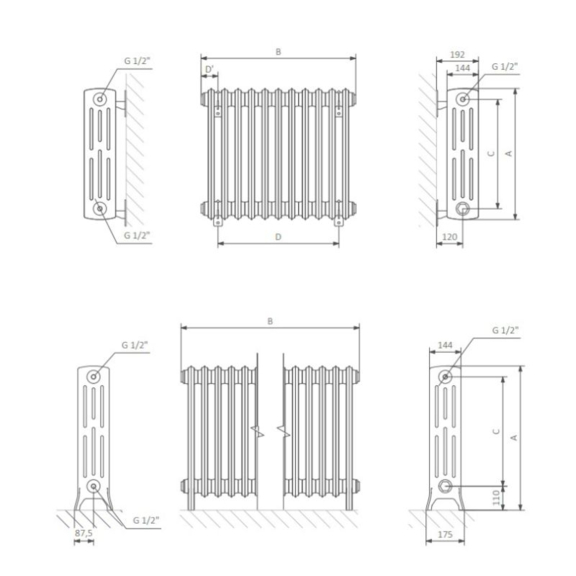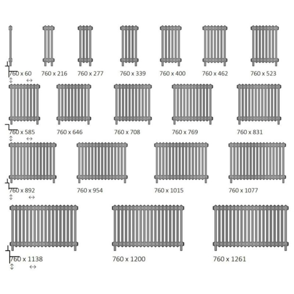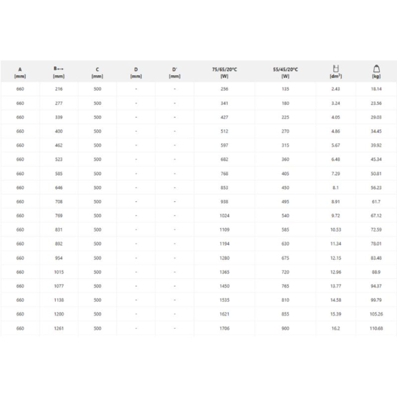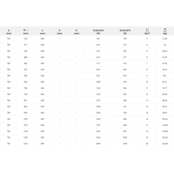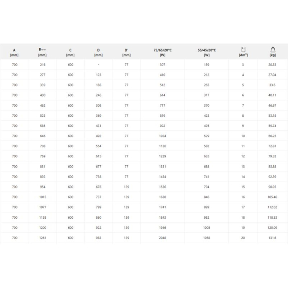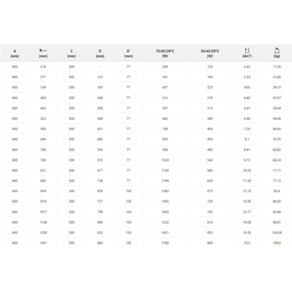 Dostupný ve verzi - vodní, co se týče způsobu montáže: stojící na zemi (+ výška nožiček 60 mm) nebo závěsný na stěnu. Výkon: 256–2048 W.