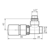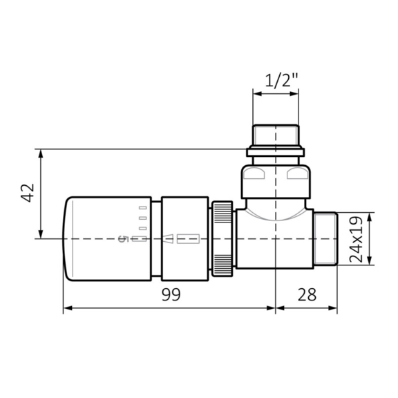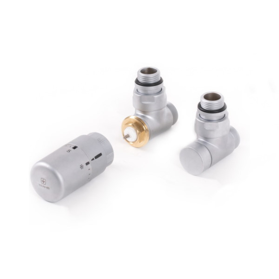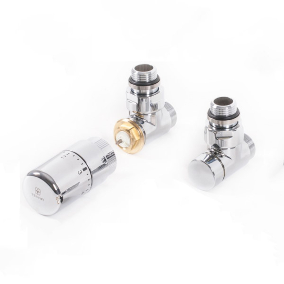 Rohová termostatická designová sada obsahuje: termostatický ventil, uzavírací ventil, termostatickou hlavici SLIM, adaptéry AL-PEX ∅ 16x2 a měď ∅ 15.