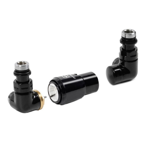 Úhlová termostatická designová sada značky Terma s možností výběru libovolného barevného provedení vyrobeného na míru, umožňuje přizpůsobit sadu k libovolnému radiátoru nebo jiným doplňkům.