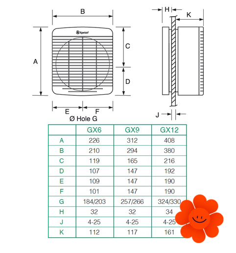 Všechny typy mají lesklý, dekorativní, bílý povrch. Ventilátor se skládá ze tří částí, což umožňuje jednoduchou montáž na stěnu, případně je možné instalovat ventilátor do jednoduchých skleněných výplní (GX6 a GX9 s max. tloušťkou skla 25 mm). Všechny typy jsou vybavené elektricky ovládanou klapkou. Bezhlučné otevírání a zavírání klapky je zajištěno na principu tepelné roztažnosti (bimetal). V případě požadavku na permanentní nebo nenucené větrání je možné klapku vyblokovat odpojením ovládání.