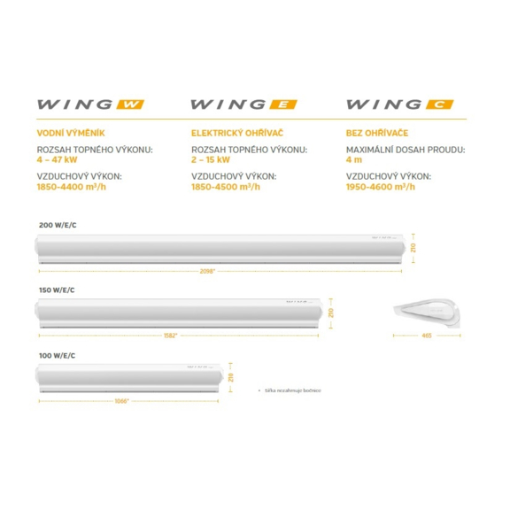 Dveřní clona WING je zařízení nové generace charakteristické svou lehkostí a moderním designem. Její tvary zefektivňují průtok vzduchu a tím snižují hlučnost zařízení. Přímo v místě instalace můžete jednoduše nastavit zařízení podle vašich akustických požadavků nebo požadavků na výkon díky elektronickému řízení pohonu.