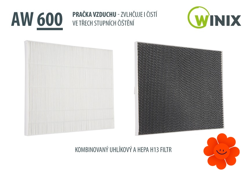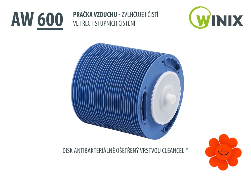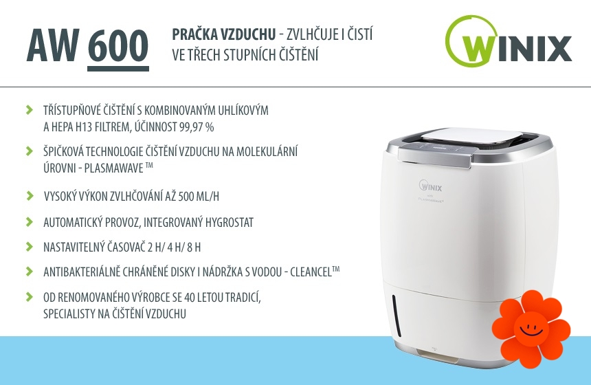 Pračka vzduchu Winix AW-600 je ideální kombinací čističky a zvlhčovače vzduchu. Nazývá se pračkou vzduchu díky možnosti plně automatického režimu, při kterém se stará o udržování vlhkosti v místnosti, čistotu vzduchu a ionizaci vzduchu. Winix AW-600 oceníte zejména během každého chřipkového období. Suchý vzduch, který se nasává přes disky s antibakteriální úpravou Cleancel® je pomocí vodní lázně přirozeně zvlhčený. Zvlhčený vzduch je dále pročištěn prostřednictvím kombinovaného uhlíkového a HEPA filtru s účinností 99,97 % a technologiíe PlasmaWave®.