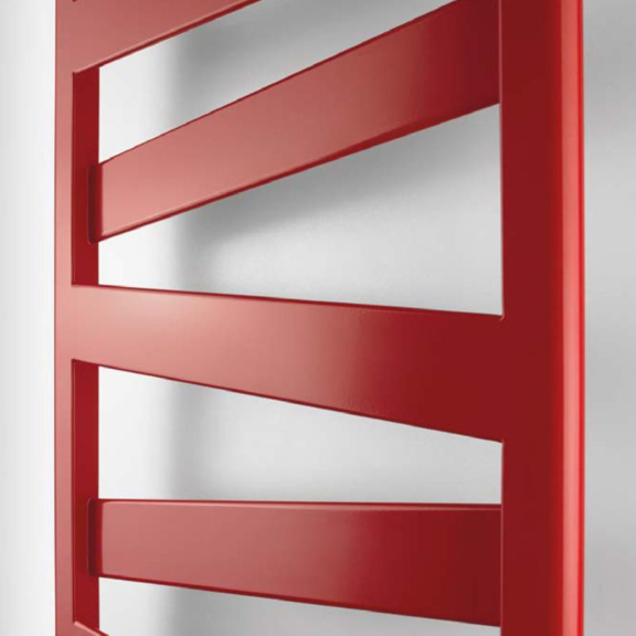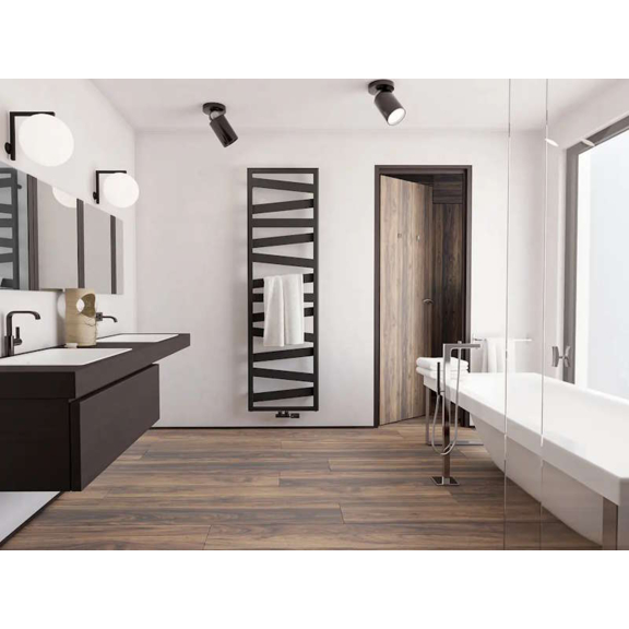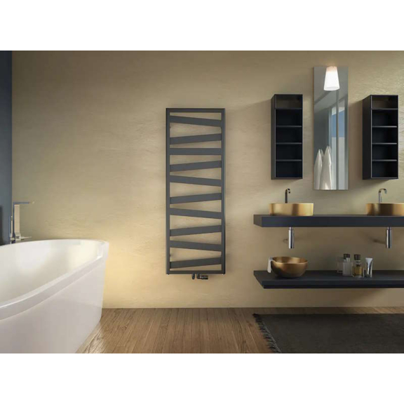 Dva řady šikmo uspořádaných plochých trubek dodávají radiátoru moderní a inovativní vzhled, který zároveň umožňuje efektivní sušení ručníků.